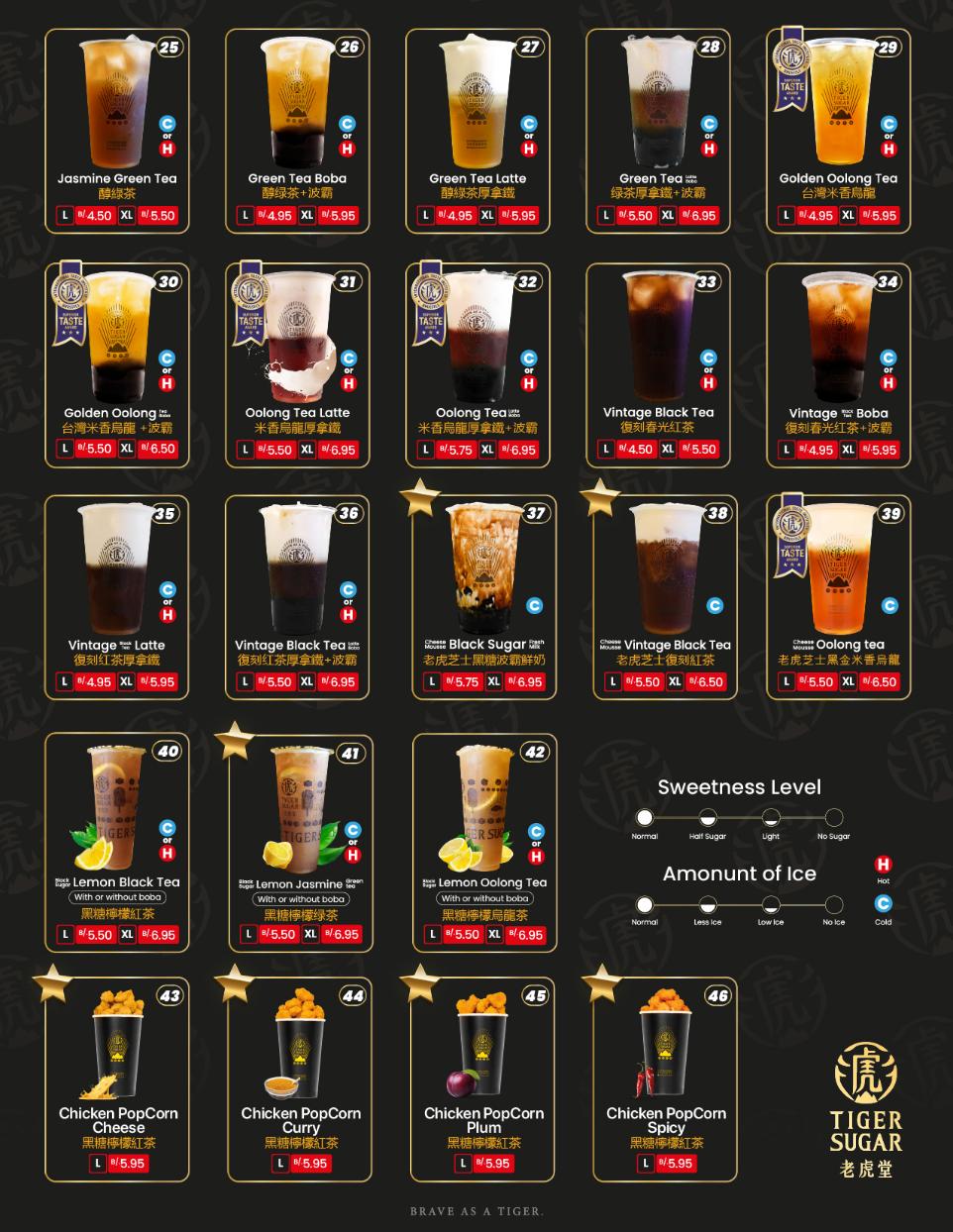 Con más de una década de desarrollo, fuimos pioneros en crear el primer postre “bebida”. Nuestras icónicas rayas de Black Sugar representan la esencia del tigre y nuestra identidad. Cada sorbo es una invitación a conocer la calidez y riqueza de la cultura taiwanesa.